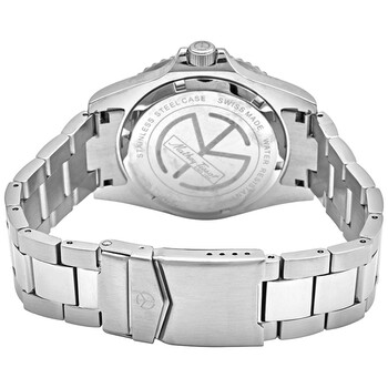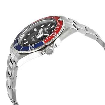 Stainless steel case with a stainless steel bracelet. Fixed stainless steel bezel with a blue and red (Pepsi) ring. Black dial with luminous silver-tone hands and dot hour markers. Minute markers around the outer rim. Dial Type: Analog. Luminescent hands and markers. Date display at the 3 o'clock position. Quartz movement. Scratch resistant mineral crystal. Solid case back. Round case shape. Case size: 42 mm. Band width: 20 mm. Fold over clasp. Water resistant at 100 meters / 330 feet. Functions: date, hour, minute, second. Mathey Vintage Series. Sport watch style. Watch label: Swiss Made. Mathey-Tissot Mathey Vintage Quartz Black Dial Pepsi Bezel Men's Watch H9010AR.