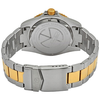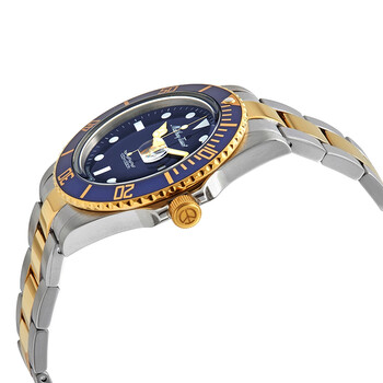 Stainless steel case with a two-tone (silver-tone and yellow gold-tone) stainless steel bracelet. Uni-directional rotating yellow gold-tone bezel with a blue ring. Blue dial with luminous yellow gold-tone hands and dot hour markers. Minute markers around the outer rim. Dial Type: Analog. Luminescent hands. Date display at the 3 o'clock position. Quartz movement. Scratch resistant sapphire crystal. Screw down crown. Solid case back. Round case shape. Case size: 42 mm. Case thickness: 12 mm. Band width: 20 mm. Fold over clasp. Water resistant at 100 meters / 330 feet. Functions: date, hour, minute, second. Casual watch style. Watch label: Swiss Made. Mathey-Tissot Mathey Vintage Quartz Blue Dial Men's Watch H9010BBU.