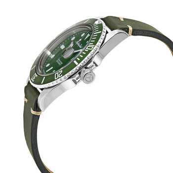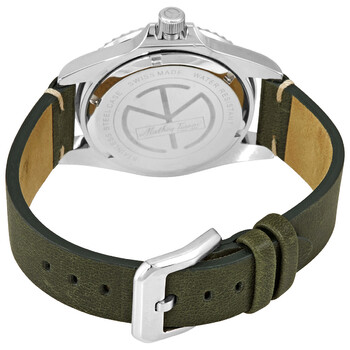 Stainless steel case with a green leather strap. Fixed stainless steel bezel with a green ring. Green dial with luminous silver-tone hands and dot hour markers. Minute markers around the outer rim. Dial Type: Analog. Luminescent hands and markers. Date display at the 3 o'clock position. Quartz movement. Scratch resistant mineral crystal. Solid case back. Round case shape. Case size: 42 mm. Band width: 20 mm. Tang clasp. Water resistant at 100 meters / 330 feet. Functions: date, hour, minute, second. Mathey Vintage Series. Sport watch style. Watch label: Swiss Made. Mathey-Tissot Mathey Vintage Quartz Green Dial Men's Watch H9010ALV.