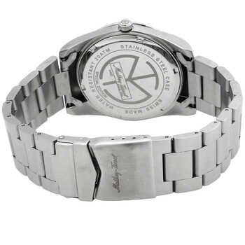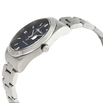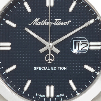 Stainless steel case with a stainless steel bracelet. Fixed stainless steel bezel. Blue dial with luminous silver-tone hands and index hour markers. Minute markers around the outer rim. Dial Type: Analog. Luminescent hands and markers. Date display at the 3 o'clock position. Quartz movement. Scratch resistant mineral crystal. Pull / push crown. Solid case back. Round case shape. Case size: 42 mm. Band width: 20 mm. Fold over clasp. Water resistant at 200 meters / 660 feet. Functions: date, hour, minute, second. Mathy Chess Series. Casual watch style. Watch label: Swiss Made. Mathey-Tissot Mathy Chess Quartz Blue Dial Men's Watch H452ABU.