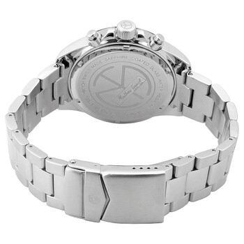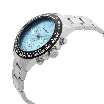 Silver-tone stainless steel case and bracelet. Uni-directional rotating black stainless steel bezel. Blue dial with silver-tone hands and index hour markers. Minute markers around the outer rim. Dial Type: Analog. Luminescent hands. Date display at the 4 o'clock position. Chronograph - three sub-dials displaying: 60 second, 30 minute and 12 hour. Ronda Caliber 5030.D quartz movement. Scratch resistant mineral crystal. Pull / push crown. Solid case back. Round case shape, case size: 42 mm. Fold over clasp. Water resistant at 100 meters / 330 feet. Functions: chronograph, date, hour, minute, second. Mathy Chrono Series. Casual watch style. Watch label: Swiss Made. Mathey-Tissot Mathy Chrono Chronograph Quartz Blue Dial Men's Watch H9010CHABU.
