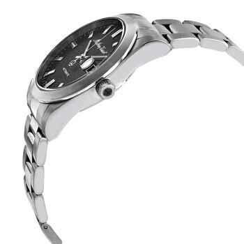 Silver-tone stainless steel case and bracelet. Fixed silver-tone stainless steel bezel. Black dial with luminous silver-tone hands and index hour markers. Minute markers around the outer rim. Dial Type: Analog. Luminescent hands and markers. Date display at the 3 o'clock position. STP Caliber STP1-11 Automatic movement, based upon ETA 2824-2, containing 26 Jewels, bitting at 28800 vph, and has a power reserve of approximately 44 hours. Scratch resistant sapphire crystal. Pull / push crown. Transparent case back. Round case shape, case size: 42 mm, case thickness: 9 mm. Band width: 20 mm. Fold over clasp with a safety release. Water resistant at 50 meters / 165 feet. Functions: date, hour, minute, second. Mathy I Series. Casual watch style. Watch label: Swiss Made. Mathey-Tissot Mathy I Automatic Black Dial Men's Watch H1450ATAN.