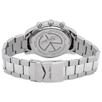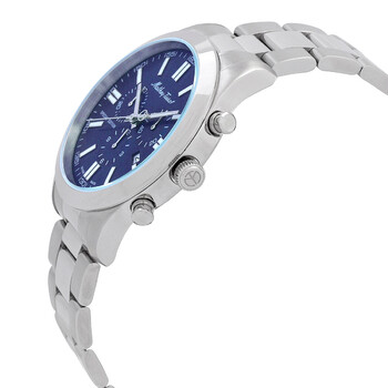 Silver-tone stainless steel case and bracelet. Fixed silver-tone stainless steel bezel. Blue dial with silver-tone hands and index hour markers. Minute markers around the outer rim. Dial Type: Analog. Luminescent hands. Date display at the 4 o'clock position. Chronograph - three sub-dials displaying: 60 second, 30 minute and 12 hour. Ronda Caliber 5030.D quartz movement. Scratch resistant mineral crystal. Pull / push crown. Solid case back. Round case shape, case size: 44 mm. Fold over clasp with a safety release. Water resistant at 50 meters / 165 feet. Functions: chronograph, date, hour, minute, small second. Mathy I Jumbo Chrono Series. Casual watch style. Watch label: Swiss Made. Mathey-Tissot Mathy I Jumbo Chrono Chronograph Quartz Blue Dial Men's Watch H455CHABU.