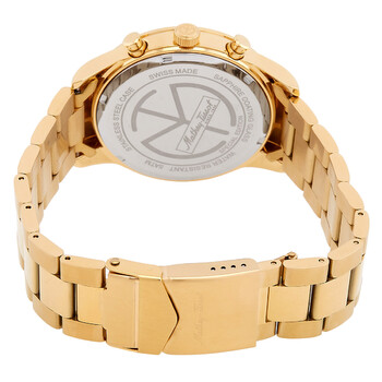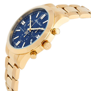 Yellow gold-tone stainless steel case and bracelet. Fixed yellow gold-tone stainless steel bezel. Blue dial with yellow gold-tone hands and index hour markers. Minute markers around the outer rim. Dial Type: Analog. Luminescent hands. Date display at the 4 o'clock position. Chronograph - three sub-dials displaying: 60 second, 30 minute and 12 hour. Ronda Caliber 5030.D quartz movement. Scratch resistant mineral crystal. Pull / push crown. Solid case back. Round case shape, case size: 44 mm. Fold over clasp with a safety release. Water resistant at 50 meters / 165 feet. Functions: chronograph, date, hour, minute, small second. Mathy I Jumbo Chrono Series. Casual watch style. Watch label: Swiss Made. Mathey-Tissot Mathy I Jumbo Chrono Chronograph Quartz Blue Dial Men's Watch H455CHPBU.