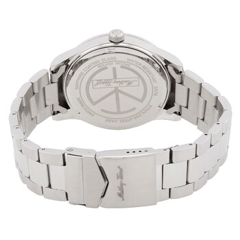 Silver-tone stainless steel case and bracelet. Fixed silver-tone stainless steel bezel. Blue dial with silver-tone hands and index hour markers. Minute markers around the outer rim. Dial Type: Analog. Luminescent hands. Date display at the 3 o'clock position. Ronda Caliber 515 H3 quartz movement. Scratch resistant mineral crystal. Pull / push crown. Solid case back. Round case shape, case size: 44 mm. Fold over clasp with a safety release. Water resistant at 50 meters / 165 feet. Functions: date, hour, minute, second. Mathy I Jumbo Series. Casual watch style. Watch label: Swiss Made. Mathey-Tissot Mathy I Jumbo Quartz Blue Dial Men's Watch H455ABU.