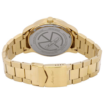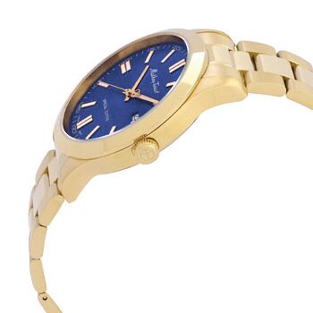 Yellow gold-tone stainless steel case and bracelet. Fixed yellow gold-tone stainless steel bezel. Blue dial with yellow gold-tone hands and index hour markers. Minute markers around the outer rim. Dial Type: Analog. Luminescent hands. Date display at the 3 o'clock position. Ronda Caliber 515 H3 quartz movement. Scratch resistant mineral crystal. Pull / push crown. Solid case back. Round case shape, case size: 44 mm. Fold over clasp with a safety release. Water resistant at 50 meters / 165 feet. Functions: date, hour, minute, second. Mathy I Jumbo Series. Casual watch style. Watch label: Swiss Made. Mathey-Tissot Mathy I Jumbo Quartz Blue Dial Men's Watch H455PBU.