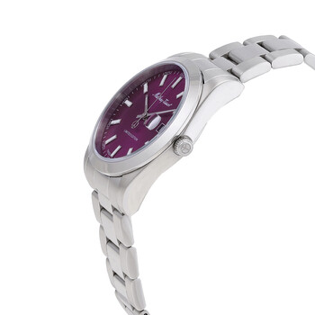 Stainless steel case with a stainless steel bracelet. Fixed stainless steel bezel. Purple dial with luminous silver-tone hands and index hour markers. Arabic numeral minute markers (at 5 minute intervals). Minute markers around the outer rim. Dial Type: Analog. Luminescent hands and markers. Date display at the 3 o'clock position. Ronda caliber 505 H3 quartz movement. Scratch resistant mineral crystal. Pull / push crown. Solid case back. Round case shape. Case size: 42 mm. Case thickness: 11 mm. Band width: 20 mm. Fold over clasp. Water resistant at 50 meters / 165 feet. Functions: date, hour, minute, second. Mathy I Le Series. Casual watch style. Watch label: Swiss Made. Mathey-Tissot Mathy I LE Quartz Purple Dial Men's Watch H451PU.