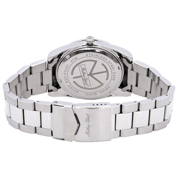 Silver-tone stainless steel case and bracelet. Fixed silver-tone stainless steel bezel. Orange dial with silver-tone hands and index hour markers. Arabic numeral minute markers (at 5 minute intervals). Dial Type: Analog. Luminescent hands and markers. Date display at the 3 o'clock position. Ronda Caliber 505 quartz movement. Scratch resistant mineral crystal. Pull / push crown. Solid case back. Round case shape, case size: 42 mm, case thickness: 11 mm. Deployment with push button release clasp. Water resistant at 50 meters / 165 feet. Functions: date, hour, minute, second. Mathy I Series. Casual watch style. Watch label: Swiss Made. Mathey-Tissot Mathy I Quartz Orange Dial Men's Watch H451OR.