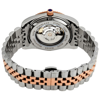 Silver-tone stainless steel case with a two-tone (silver-tone and rose gold-tone) stainless steel bracelet. Fixed rose gold-tone stainless steel bezel. Silver dial with luminous rose gold-tone hands and index hour markers. Minute markers around the outer rim. Dial Type: Analog. Luminescent hands and markers. Date display at the 3 o'clock position. STP Caliber STP1-11 Automatic movement, based upon ETA 2824-2, containing 26 Jewels, bitting at 28800 vph, and has a power reserve of approximately 44 hours. Scratch resistant antireflex sapphire crystal. Pull / push crown. Transparent case back. Round case shape, case size: 42 mm, case thickness: 9 mm. Band width: 20 mm. Fold over clasp with a push button release. Water resistant at 50 meters / 165 feet. Functions: date, hour, minute, second. Mathy IIi Series. Casual watch style. Watch label: Swiss Made. Mathey-Tissot Mathy III Automatic Silver Dial Men's Watch H1810ATRA.