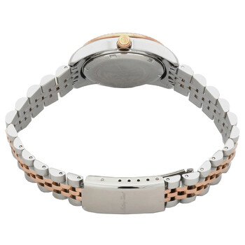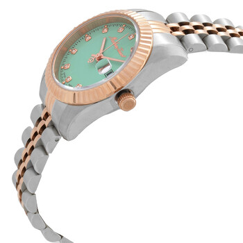 Silver-tone stainless steel case with a two-tone (silver-tone and rose gold-tone) stainless steel bracelet. Fixed rose gold-tone stainless steel bezel. Green dial with rose gold-tone hands and index hour markers. Minute markers around the outer rim. Dial Type: Analog. Luminescent hands. Date display at the 3 o'clock position. Ronda Caliber 585 quartz movement. Scratch resistant mineral crystal. Pull / push crown. Solid case back. Round case shape, case size: 32 mm. Fold over clasp. Water resistant at 50 meters / 165 feet. Functions: date, hour, minute, second. Mathy IIi Series. Casual watch style. Watch label: Swiss Made. Mathey-Tissot Mathy III Quartz Green Dial Ladies Watch D810RV.