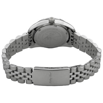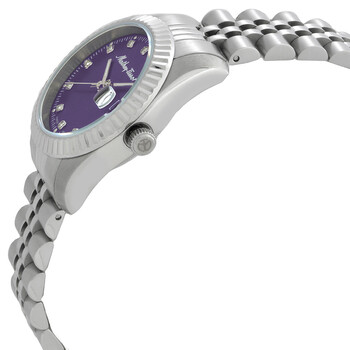 Silver-tone stainless steel case and bracelet. Fixed silver-tone stainless steel bezel. Purple dial with silver-tone hands and index hour markers. Minute markers around the outer rim. Dial Type: Analog. Luminescent hands. Date display at the 3 o'clock position. Quartz movement. Scratch resistant sapphire crystal. Pull / push crown. Solid case back. Round case shape, case size: 30 mm. Fold over clasp. Water resistant at 50 meters / 165 feet. Functions: date, hour, minute, second. Mathy IIi Series. Casual watch style. Watch label: Swiss Made. Mathey-Tissot Mathy III Quartz Purple Dial Ladies Watch D810APU.