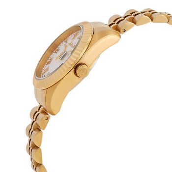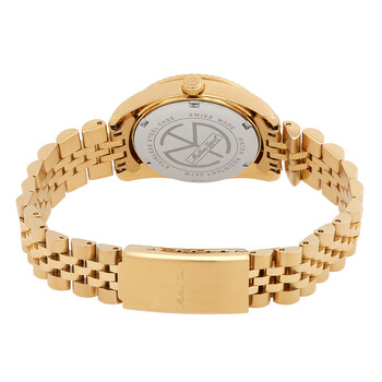 Yellow gold-tone stainless steel case and bracelet. Fixed yellow gold-tone stainless steel bezel. White dial with yellow gold-tone hands and Roman numeral hour markers. Minute markers around the outer rim. Dial Type: Analog. Luminescent hands. Date display at the 3 o'clock position. Ronda Caliber 585 quartz movement. Scratch resistant mineral crystal. Pull / push crown. Solid case back. Round case shape, case size: 32 mm. Fold over clasp with a safety release. Water resistant at 50 meters / 165 feet. Functions: date, hour, minute, second. Mathy IIi Roman Series. Casual watch style. Watch label: Swiss Made. Mathey-Tissot Mathy III Roman Quartz White Dial Ladies Watch D810PBRI.