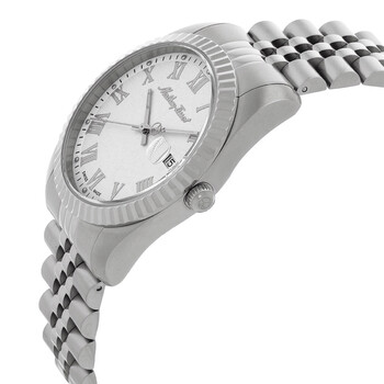 Silver-tone stainless steel case and bracelet. Fixed silver-tone stainless steel bezel. White dial with silver-tone hands and Roman numeral hour markers. Minute markers around the outer rim. Dial Type: Analog. Luminescent hands. Date display at the 3 o'clock position. Ronda Caliber 515 quartz movement. Scratch resistant mineral crystal. Pull / push crown. Solid case back. Round case shape, case size: 40 mm. Fold over clasp with a safety release. Water resistant at 50 meters / 165 feet. Functions: date, hour, minute, second. Mathy IIi Roman Series. Casual watch style. Watch label: Swiss Made. Mathey-Tissot Mathy III Roman White Dial Unisex Watch H810ABR.