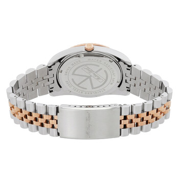 Silver-tone stainless steel case with a two-tone (silver-tone and rose gold-tone) stainless steel bracelet. Fixed rose gold-tone stainless steel bezel. White dial with rose gold-tone hands and Roman numeral hour markers. Minute markers around the outer rim. Dial Type: Analog. Luminescent hands. Date display at the 3 o'clock position. Ronda Caliber 515 quartz movement. Scratch resistant mineral crystal. Pull / push crown. Solid case back. Round case shape, case size: 40 mm. Fold over clasp with a safety release. Water resistant at 50 meters / 165 feet. Functions: date, hour, minute, second. Mathy IIi Roman Series. Casual watch style. Watch label: Swiss Made. Mathey-Tissot Mathy III Roman White Dial Unisex Watch H810BRA.