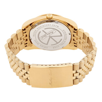 Yellow gold-tone stainless steel case and bracelet. Fixed yellow gold-tone stainless steel bezel. White dial with yellow gold-tone hands and Roman numeral hour markers. Minute markers around the outer rim. Dial Type: Analog. Luminescent hands. Date display at the 3 o'clock position. Ronda Caliber 515 quartz movement. Scratch resistant mineral crystal. Pull / push crown. Solid case back. Round case shape, case size: 40 mm. Fold over clasp with a safety release. Water resistant at 50 meters / 165 feet. Functions: date, hour, minute, second. Mathy IIi Roman Series. Casual watch style. Watch label: Swiss Made. Mathey-Tissot Mathy III Roman White Dial Unisex Watch H810PBRI.