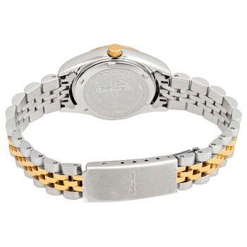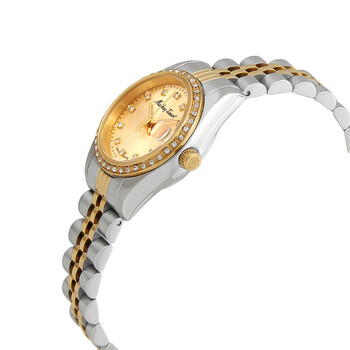 Stainless steel case with a two-tone (silver-tone and yellow gold-tone) stainless steel bracelet. Fixed yellow gold-tone bezel. Champagne dial with luminous yellow gold-tone hands and crystal hour markers. Minute markers around the outer rim. Dial Type: Analog. Luminescent hands and markers. Date display at the 3 o'clock position. Ronda caliber 585 H3 quartz movement. Scratch resistant mineral crystal. Pull / push crown. Solid case back. Round case shape. Case size: 26 mm. Case thickness: 3 mm. Deployment clasp with a push button release. Water resistant at 50 meters / 165 feet. Functions: date, hour, minute, second. Additional Info: zirconia index and zirconia on the bezel. Mathy IV Series. Fashion watch style. Watch label: Swiss Made. Mathey-Tissot Mathy IV Champagne Dial Ladies Watch D709BDQI.