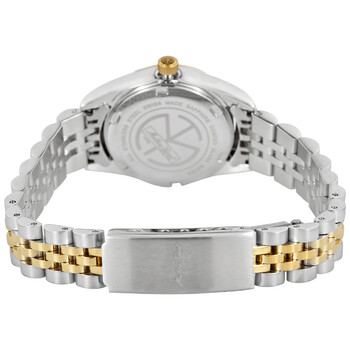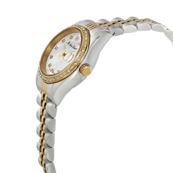 Stainless steel case with a two-tone (silver-tone and yellow gold-tone) stainless steel bracelet. Fixed yellow gold-tone bezel set with zirconia crystals. Mother of pearl dial with yellow gold-tone hands and zirconia crystal hour markers. Minute markers around the outer rim. Dial Type: Analog. Luminescent hands and markers. Date display at the 3 o'clock position. Ronda caliber 585 h3 quartz movement. Scratch resistant mineral crystal. Pull / push crown. Solid case back. Round case shape. Case size: 26 mm. Case thickness: 3 mm. Deployment clasp. Water resistant at 50 meters / 165 feet. Functions: date, hour, minute, second. Additional Info: zirconia index and zirconia on the bezel. Mathy IV Series. Fashion watch style. Watch label: Swiss Made. Mathey-Tissot Mathy IV Quartz Ladies Watch D709BQI.