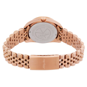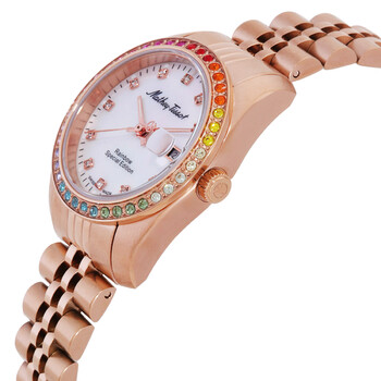 Rose gold-tone stainless steel case and bracelet. Fixed bezel. White dial with rose gold-tone hands and index hour markers. Minute markers around the outer rim. Dial Type: Analog. Luminescent hands. Date display at the 3 o'clock position. Ronda Caliber 585 quartz movement. Scratch resistant mineral crystal. Pull / push crown. Solid case back. Round case shape, case size: 32 mm. Fold over clasp with a safety release. Water resistant at 50 meters / 165 feet. Functions: date, hour, minute, second. Additional Info: mother of pearl, zirconia. Mathy Rainbow Series. Fashion watch style. Watch label: Swiss Made. Mathey-Tissot Mathy Rainbow Quartz White Dial Ladies Watch D809PQI.