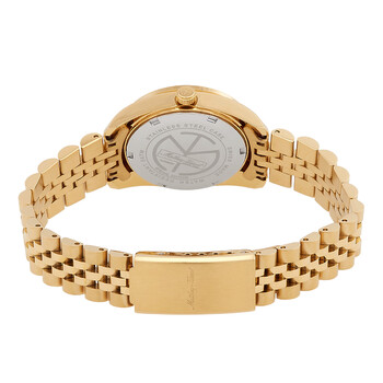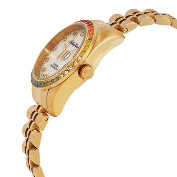 Yellow gold-tone stainless steel case and bracelet. Fixed bezel. White dial with yellow gold-tone hands and index hour markers. Minute markers around the outer rim. Dial Type: Analog. Luminescent hands. Date display at the 3 o'clock position. Ronda Caliber 585 quartz movement. Scratch resistant mineral crystal. Pull / push crown. Solid case back. Round case shape, case size: 32 mm. Fold over clasp with a safety release. Water resistant at 50 meters / 165 feet. Functions: date, hour, minute, second. Additional Info: mother of pearl, zirconia. Mathy Rainbow Series. Fashion watch style. Watch label: Swiss Made. Mathey-Tissot Mathy Rainbow Quartz White Dial Ladies Watch D809PQYI.
