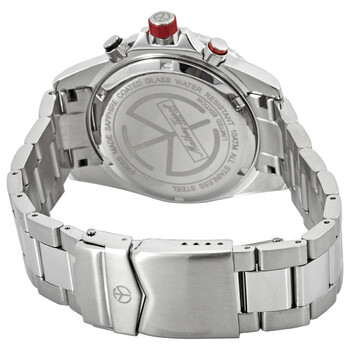 Silver-tone stainless steel case and bracelet. Uni-directional rotating stainless steel with an inlaid black and red ring bezel. Black dial with luminous silver-tone hands and index hour markers. Minute markers. Tachymeter markings around the outer rim. Dial Type: Analog. Luminescent hands and markers. Date display between the 4 and 5 o'clock positions. Chronograph - three sub-dials displaying: 60 second, 30 minute and 12 hour. Ronda Caliber 5030.D quartz movement. Scratch resistant sapphire crystal. Screw down crown. Solid case back. Round case shape, case size: 42 mm, case thickness: 13 mm. Fold over clasp. Water resistant at 100 meters / 330 feet. Functions: chronograph, date, hour, minute, small second. Mathy Strike Series. Casual watch style. Watch label: Swiss Made. Mathey-Tissot Mathy Strike Chronograph Quartz Black Dial Men's Watch H908CHRN.