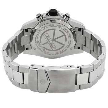 Stainless steel case with a stainless steel bracelet. Uni-directional rotating stainless steel bezel with an inlaid black ring. Green dial with luminous silver-tone hands and index hour markers. Minute markers. Tachymeter markings around the outer rim. Dial Type: Analog. Luminescent hands and markers. Date display between the 4 and 5 o'clock positions. Chronograph - three black sub-dials displaying: 60 second, 30 minute and 12 hour. Ronda caliber 5030.D quartz movement. Scratch resistant mineral crystal. Screw down crown. Solid case back. Round case shape. Case size: 42 mm. Band width: 20 mm. Fold over clasp. Water resistant at 100 meters / 330 feet. Functions: chronograph, tachymeter, date, hour, minute, small second. Mathy Strike Series. Casual watch style. Watch label: Swiss Made. Mathey-Tissot Mathy Strike Chronograph Quartz Green Dial Men's Watch H908CHAV.