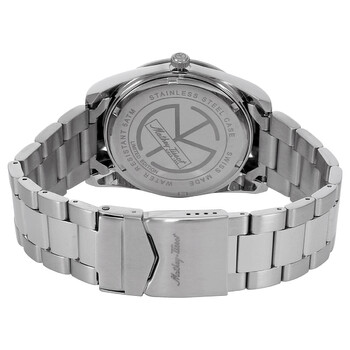 Stainless steel case with a stainless steel bracelet. Fixed stainless steel bezel. Yellow dial with luminous silver-tone hands and index hour markers. Arabic numeral minute markers (at 5 minute intervals). Minute markers around the outer rim. Dial Type: Analog. Luminescent hands and markers. Date display at the 3 o'clock position. Ronda caliber 505 quartz movement. Scratch resistant mineral crystal. Pull / push crown. Solid case back. Round case shape. Case size: 42 mm. Case thickness: 11 mm. Band width: 20 mm. Deployment clasp with a push button release. Water resistant at 30 meters / 100 feet. Functions: date, hour, minute, second. Mathy Sunray Series. Casual watch style. Watch label: Swiss Made. Mathey-Tissot Mathy Sunray Quartz Men's Watch H451J.