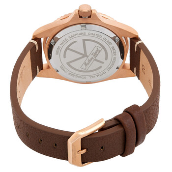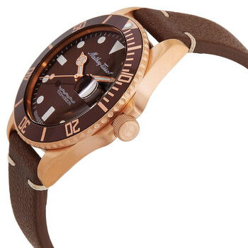 Rose gold-tone stainless steel case with a brown genuine leather strap. Uni-directional rotating brown stainless steel bezel. Brown dial with rose gold-tone hands and index hour markers. Minute markers around the outer rim. Dial Type: Analog. Luminescent hands and markers. Date display at the 3 o'clock position. Ronda Caliber 505 quartz movement. Scratch resistant mineral crystal. Solid case back. Round case shape, case size: 42 mm. Water resistant at 100 meters / 330 feet. Functions: date, hour, minute, second. Mathy Vintage Bronze Series. Casual watch style. Watch label: Swiss Made. Mathey-Tissot Mathy Vintage Bronze Quartz Brown Dial Men's Watch H901BZLM.