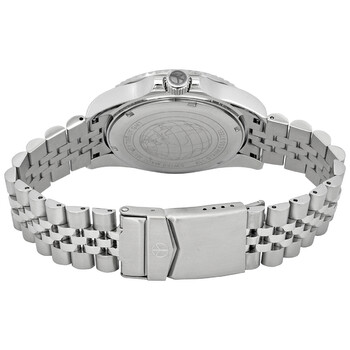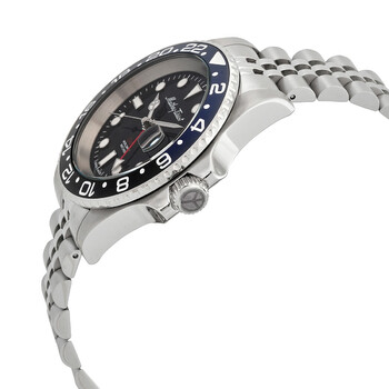 Stainless steel case with a stainless steel bracelet. Uni-directional rotating stainless steel bezel with a black and blue (Batman) ring showing 24 hour (GMT) markers. Black dial with luminous silver-tone hands and dot hour markers. Minute markers around the outer rim. Dial Type: Analog. Luminescent hands and markers. Date display at the 3 o'clock position. Ronda 515 H24 AG2 quartz movement. Scratch resistant sapphire crystal. Screw down crown. Solid case back. Round case shape. Case size: 42 mm. Case thickness: 8.55 mm. Band width: 20 mm. Fold over clasp with a safety release. Water resistant at 100 meters / 330 feet. Functions: date, hour, minute, second, GMT. Casual watch style. Watch label: Swiss Made. Mathey-Tissot Mathy Vintage GMT Black Dial Batman Bezel Men's Watch H903ANB.