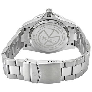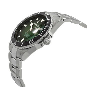 Silver-tone stainless steel case and bracelet. Uni-directional rotating silver-tone stainless steel with an inlaid black aluminium ring bezel. Green dial with luminous silver-tone hands and dot hour markers. Minute markers around the outer rim. Dial Type: Analog. Luminescent hands and markers. Date display at the 3 o'clock position. STP Caliber STP1-11 Automatic movement, based upon ETA 2824-2, containing 26 Jewels, bitting at 28800 vph, and has a power reserve of approximately 44 hours. Scratch resistant sapphire crystal. Screw down crown. Solid case back. Round case shape, case size: 44 mm, case thickness: 8.55 mm. Band width: 20 mm. Deployment with push button release clasp. Water resistant at 300 meters / 1000 feet. Functions: date, hour, minute, second. Mathy Vintage Jumbo Series. Casual watch style. Watch label: Swiss Made. Mathey-Tissot Mathy Vintage Jumbo Green Dial Men's Watch H907ATNV.