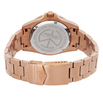 Rose gold PVD stainless steel case and bracelet. Uni-directional rotating rose gold PVD bezel with an inlaid blue ring. Blue dial with luminous silver-tone hands and dot hour markers. Minute markers around the outer rim. Dial Type: Analog. Luminescent hands and markers. Date display at the 3 o'clock position. Ronda caliber 505 H3 quartz movement. Scratch resistant mineral crystal. Screw down crown. Solid case back. Round case shape. Case size: 42 mm. Case thickness: 12 mm. Band width: 20 mm. Fold over clasp. Water resistant at 100 meters / 330 feet. Functions: date, hour, minute, second. Additional Info: mat finish. Vintage Le Series. Casual watch style. Watch label: Swiss Made. Mathey-Tissot Mathy Vintage Quartz 42 mm LE Blue Dial Men's Watch H908APRBU.