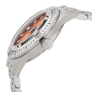 Silver-tone stainless steel case and bracelet. Uni-directional rotating silver-tone stainless steel bezel. Orange dial with silver-tone hands and index hour markers. Minute markers around the outer rim. Dial Type: Analog. Luminescent hands and markers. Date display at the 3 o'clock position. Sellita Caliber SW 200 Automatic movement, based upon ETA 2824-2, containing 26 Jewels, bitting at 28800 vph, and has a power reserve of approximately 38 hours. Scratch resistant mineral crystal. Screw down crown. Transparent case back. Round case shape, case size: 41 mm. Buckle clasp. Water resistant at 200 meters / 660 feet. Functions: date, hour, minute, second. Additional Info: comes with 2 additional straps (black leather & nato). Mergulhador Series. Casual watch style. Watch label: Swiss Made. Mathey-Tissot Mergulhador Automatic Orange Dial Men's Watch MRG3.
