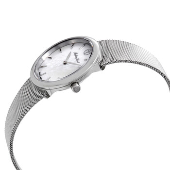 Stainless steel case with a stainless steel mesh bracelet. Fixed stainless steel bezel. Mother of pearl dial with silver-tone hands and index hour markers. Dial Type: Analog. Ronda caliber 762 quartz movement. Scratch resistant sapphire crystal. Pull / push crown. Solid case back. Round case shape. Case size: 30 mm. Case thickness: 5.5 mm. Bracelet width: 16 mm. Fold over slip through clasp. Water resistant at 50 meters / 165 feet. Functions: hour, minute. Milly Series. Casual watch style. Watch label: Swiss Made. Mathey-Tissot Milly Mother of Pearl Dial Ladies Watch D403A