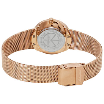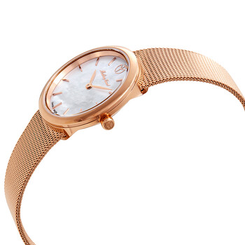 Rose gold PVD stainless steel case with a rose gold PVD stainless steel mesh bracelet. Fixed rose gold PVD bezel. Mother of pearl dial with rose gold-tone hands and index hour markers. Dial Type: Analog. Ronda caliber 762 quartz movement. Scratch resistant sapphire crystal. Pull / push crown. Solid case back. Round case shape. Case size: 30 mm. Case thickness: 5.5 mm. Band width: 16 mm. Fold over slip through clasp. Water resistant at 50 meters / 165 feet. Functions: hour, minute. Casual watch style. Watch label: Swiss Made. Mathey-Tissot Milly Quartz Mother of Pearl Dial Ladies Watch D403PI.
