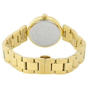 Yellow gold-tone stainless steel case and bracelet. Fixed yellow gold-tone stainless steel bezel. Mother of pearl dial with yellow gold-tone hands and diamond hour markers. Dial Type: Analog. Ronda Caliber 762 quartz movement. Scratch resistant mineral crystal. Pull / push crown. Solid case back. Round case shape, case size: 32 mm. Fold over clasp. Water resistant at 50 meters / 165 feet. Functions: hour, minute. Additional Info: diamond. Molly Series. Dress watch style. Watch label: Swiss Made. Mathey-Tissot Molly Quartz Diamond Ladies Watch D1087PQYI.