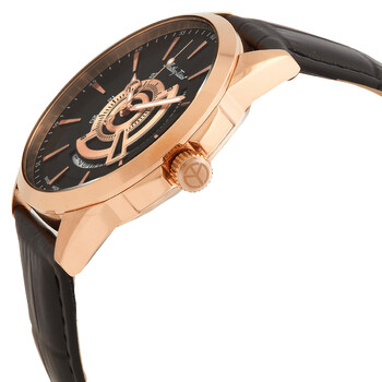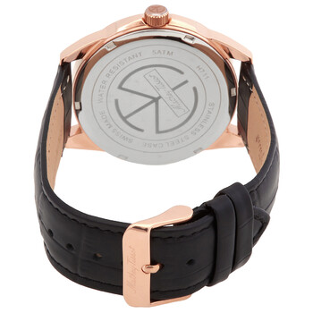 Rose gold PVD stainless steel case with a black leather strap. Fixed rose gold PVD bezel. Black dial with luminous rose gold-tone hands and index hour markers. 24 hour markers. Arabic numeral minute markers (at 5 minute intervals). Minute markers around the outer rim. Dial Type: Analog. Luminescent hands. Date display at the 4 o'clock position. Ronda caliber 515 quartz movement. Scratch resistant sapphire crystal. Pull / push crown. Solid case back. Round case shape. Case size: 42 mm. Case thickness: 8 mm. Tang clasp. Water resistant at 50 meters / 165 feet. Functions: date, hour, minute, second. Mondo Series. Casual watch style. Watch label: Swiss Movt. Mathey-Tissot Mondo Quartz Black Dial Men's Watch H711PN.