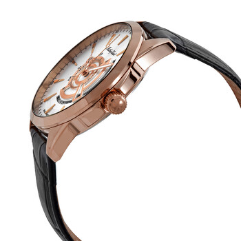 Rose gold PVD stainless steel case with a black leather strap. Fixed rose gold PVD bezel. Silver dial with luminous rose gold-tone hands and index hour markers. 24 hour markers. Arabic numeral minute markers (at 5 minute intervals). Minute markers around the outer rim. Dial Type: Analog. Luminescent hands. Date display at the 4 o'clock position. Ronda caliber 515 quartz movement. Scratch resistant sapphire crystal. Pull / push crown. Solid case back. Round case shape. Case size: 42 mm. Case thickness: 8 mm. Tang clasp. Water resistant at 50 meters / 165 feet. Functions: date, hour, minute, second. Mondo Series. Casual watch style. Watch label: Swiss Movt. Mathey-Tissot Mondo Quartz Silver Dial Men's Watch H711PS.