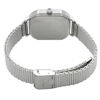Silver-tone stainless steel case and bracelet. Fixed silver-tone stainless steel bezel. Black dial with silver-tone hands and index hour markers. Dial Type: Analog. Ronda quartz movement. Scratch resistant mineral crystal. Pull / push crown. Solid case back. Square case shape, case size: 32 mm. Fold over clasp with a safety release. Water resistant at 50 meters / 165 feet. Functions: hour, minute. Monsoon Square Series. Casual watch style. Watch label: Swiss Made. Mathey-Tissot Monsoon Square Quartz Black Dial Ladies Watch D7917AN.