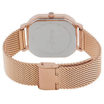 Rose gold-tone stainless steel case and bracelet. Fixed rose gold-tone stainless steel bezel. Blue dial with rose gold-tone hands and index hour markers. Dial Type: Analog. Ronda quartz movement. Scratch resistant mineral crystal. Pull / push crown. Solid case back. Square case shape, case size: 40 mm. Fold over clasp with a safety release. Water resistant at 50 meters / 165 feet. Functions: hour, minute. Monsoon Square Series. Casual watch style. Watch label: Swiss Made. Mathey-Tissot Monsoon Square Quartz Blue Dial Men's Watch H7917PBU.