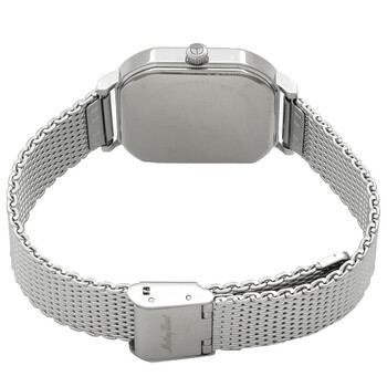 Silver-tone stainless steel case and bracelet. Fixed silver-tone stainless steel bezel. Silver-tone dial with silver-tone hands and index hour markers. Dial Type: Analog. Ronda quartz movement. Scratch resistant mineral crystal. Pull / push crown. Solid case back. Square case shape, case size: 32 mm. Fold over clasp with a safety release. Water resistant at 50 meters / 165 feet. Functions: hour, minute. Monsoon Square Series. Casual watch style. Watch label: Swiss Made. Mathey-Tissot Monsoon Square Quartz Silver Dial Ladies Watch D7917AS.