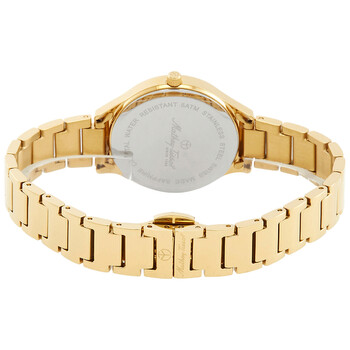 Gold-tone stainless steel case and bracelet. Fixed gold-tone stainless steel bezel. Silver dial with gold-tone hands and Roman numeral hour markers. Dial Type: Analog. Ronda Caliber 762 quartz movement. Scratch resistant sapphire crystal. Pull / push crown. Solid case back. Round case shape, case size: 32 mm, case thickness: 5 mm. Deployment with push button release clasp. Water resistant at 50 meters / 165 feet. Functions: hour, minute. Nicole Series. Dress watch style. Watch label: Swiss Movt. Mathey-Tissot Nicole Diamond Quartz Silver Dial Ladies Watch D985SPYI.