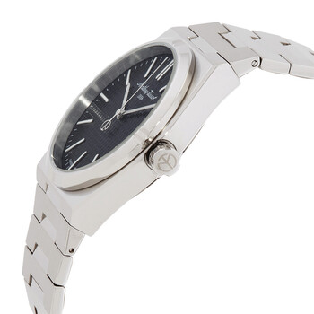 Silver-tone stainless steel case and bracelet. Fixed silver-tone stainless steel bezel. Black dial with silver-tone hands and index hour markers. Minute scale around the inner rim. Dial Type: Analog. Luminescent hands and markers. Date display at the 3 o'clock position. Ronda Caliber 515 quartz movement. Scratch resistant mineral crystal. Pull / push crown. Solid case back. Round case shape, case size: 40.5 mm. Fold over clasp with a safety release. Water resistant at 50 meters / 165 feet. Functions: date, hour, minute, second. Sport watch style. Watch label: Swiss Movt. Mathey-Tissot Quartz Black Dial Men's Watch H117AN.