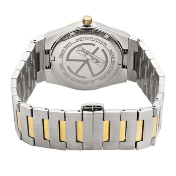 Silver-tone stainless steel case with a two-tone (silver-tone and gold-tone) stainless steel bracelet. Fixed gold-tone stainless steel bezel. Blue dial with gold-tone hands and index hour markers. Minute scale around the inner rim. Dial Type: Analog. Luminescent hands and markers. Date display at the 3 o'clock position. Quartz movement. Scratch resistant mineral crystal. Pull / push crown. Solid case back. Round case shape, case size: 36 mm. Fold over clasp with a safety release. Water resistant at 50 meters / 165 feet. Functions: date, hour, minute, second. Sport watch style. Watch label: Swiss Made. Mathey-Tissot Quartz Blue Dial Ladies Watch D117BBU.