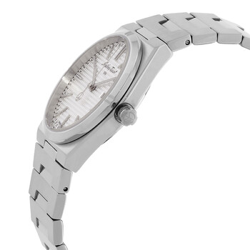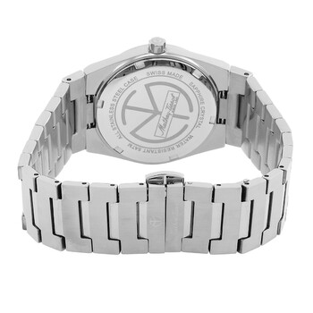 Silver-tone stainless steel case and bracelet. Fixed silver-tone stainless steel bezel. Silver dial with silver-tone hands and index hour markers. Minute scale around the inner rim. Dial Type: digital. Date display at the 3 o'clock position. Quartz movement. Scratch resistant mineral crystal. Pull / push crown. Solid case back. Round case shape, case size: 36 mm. Fold over clasp with a safety release. Water resistant at 50 meters / 165 feet. Functions: date, hour, minute, second. Sport watch style. Watch label: Swiss Made. Mathey-Tissot Quartz Digital Silver Dial Ladies Watch D117AS.