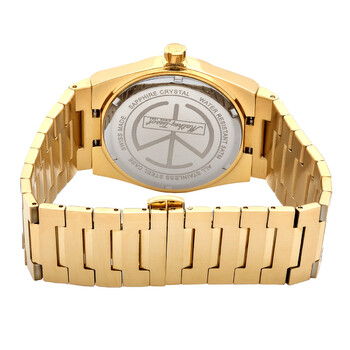 Gold-tone stainless steel case and bracelet. Fixed gold-tone stainless steel bezel. Gold dial with gold-tone hands and index hour markers. Minute scale around the inner rim. Dial Type: Analog. Luminescent hands and markers. Date display at the 3 o'clock position. Quartz movement. Scratch resistant mineral crystal. Pull / push crown. Solid case back. Round case shape, case size: 40.5 mm. Fold over clasp with a safety release. Water resistant at 50 meters / 165 feet. Functions: date, hour, minute, second. Sport watch style. Watch label: Swiss Made. Mathey-Tissot Quartz Gold Dial Men's Watch H117PDI.