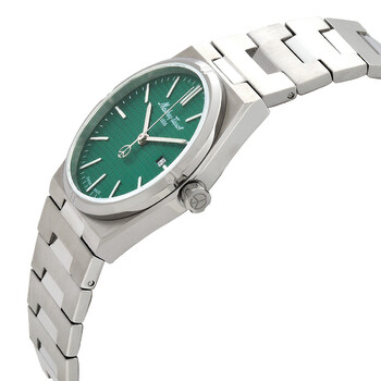 Silver-tone stainless steel case and bracelet. Fixed silver-tone stainless steel bezel. Green dial with silver-tone hands and index hour markers. Minute scale around the inner rim. Dial Type: Analog. Luminescent hands and markers. Date display at the 3 o'clock position. Quartz movement. Scratch resistant mineral crystal. Pull / push crown. Solid case back. Round case shape, case size: 36 mm. Fold over clasp with a safety release. Water resistant at 50 meters / 165 feet. Functions: date, hour, minute, second. Sport watch style. Watch label: Swiss Made. Mathey-Tissot Quartz Green Dial Ladies Watch D117AV.