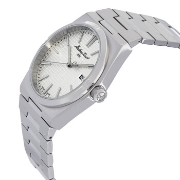 Silver-tone stainless steel case and bracelet. Fixed silver-tone stainless steel bezel. Silver dial with silver-tone hands and index hour markers. Minute scale around the inner rim. Dial Type: Analog. Luminescent hands and markers. Date display at the 3 o'clock position. Quartz movement. Scratch resistant mineral crystal. Pull / push crown. Solid case back. Round case shape, case size: 40.5 mm. Fold over clasp with a safety release. Water resistant at 50 meters / 165 feet. Functions: date, hour, minute, second. Sport watch style. Watch label: Swiss Made. Mathey-Tissot Quartz Silver Dial Men's Watch H117AS.