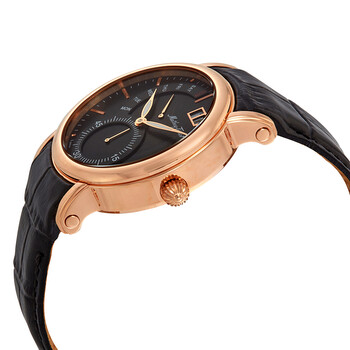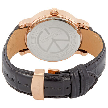 Rose gold-tone stainless steel case with a black leather strap. Fixed rose gold-tone bezel. Black dial with luminous rose gold-tone hands and index hour markers. Minute markers around the outer rim. Dial Type: Analog. Luminescent hands. Date display at the 1 o'clock position. Retrograde day of the week display. Small seconds sub-dial. Ronda caliber 7004P quartz movement. Scratch resistant sapphire glass crystal. Pull / push crown. Solid case back. Round case shape. Case size: 43 mm. Case thickness: 9 mm. Band width: 22 mm. Butterfly clasp. Water resistant at 50 meters / 165 feet. Functions: retrograde, big date, day, hour, minute, small second. Retrograde Series. Casual watch style. Watch label: Swiss Made. Mathey-Tissot Retrograde Black Dial Men's Watch H7021PN.