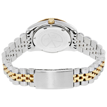 Stainless steel case with a two-tone (silver and yellow gold PVD) stainless steel bracelet. Fixed yellow gold PVD bezel. Brown dial with luminous gold-tone hands and crystal hour markers. Minute markers around the outer rim. Dial Type: Analog. Luminescent hands and markers. Date display at the 3 o'clock position. Ronda Caliber 585 quartz movement. Scratch resistant mineral crystal. Pull / push crown. Solid case back. Round case shape, case size: 32 mm, case thickness: 3 mm. Fold over clasp. Water resistant at 30 meters / 100 feet. Functions: date, hour, minute, second. Rolly IIi Series. Dress watch style. Watch label: Swiss Made. Mathey-Tissot Rolly III Crystal Brown Dial Ladies Watch D810BM.