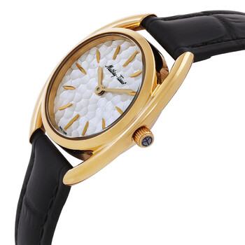 Yellow gold-tone stainless steel case with a black genuine leather strap. Fixed yellow gold-tone stainless steel bezel. Silver-tone dial with yellow gold-tone hands and index hour markers. Dial Type: Analog. Ronda Caliber 762 quartz movement. Scratch resistant mineral crystal. Pull / push crown. Solid case back. Round case shape, case size: 28 mm. Tang clasp. Water resistant at 50 meters / 165 feet. Functions: hour, minute. Saphira Series. Casual watch style. Watch label: Swiss Made. Mathey-Tissot Saphira Quartz Silver Dial Ladies Watch D933PLYI.