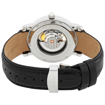 Silver-tone stainless steel case with a black leather strap. Fixed silver-tone stainless steel bezel. Black dial with blue hands and index hour markers. Minute markers around the outer rim. Dial Type: Analog. Luminescent hands and markers. Landeron 24 automatic movement. Scratch resistant mineral crystal. Pull / push crown. Transparent case back. Round case shape, case size: 42 mm. Deployment with push button release clasp. Water resistant at 50 meters / 165 feet. Functions: hour, minute, second. Skeleton Series. Dress watch style. Watch label: Swiss Made. Mathey-Tissot Skeleton Automatic Black Dial Men's Watch H7053AN.